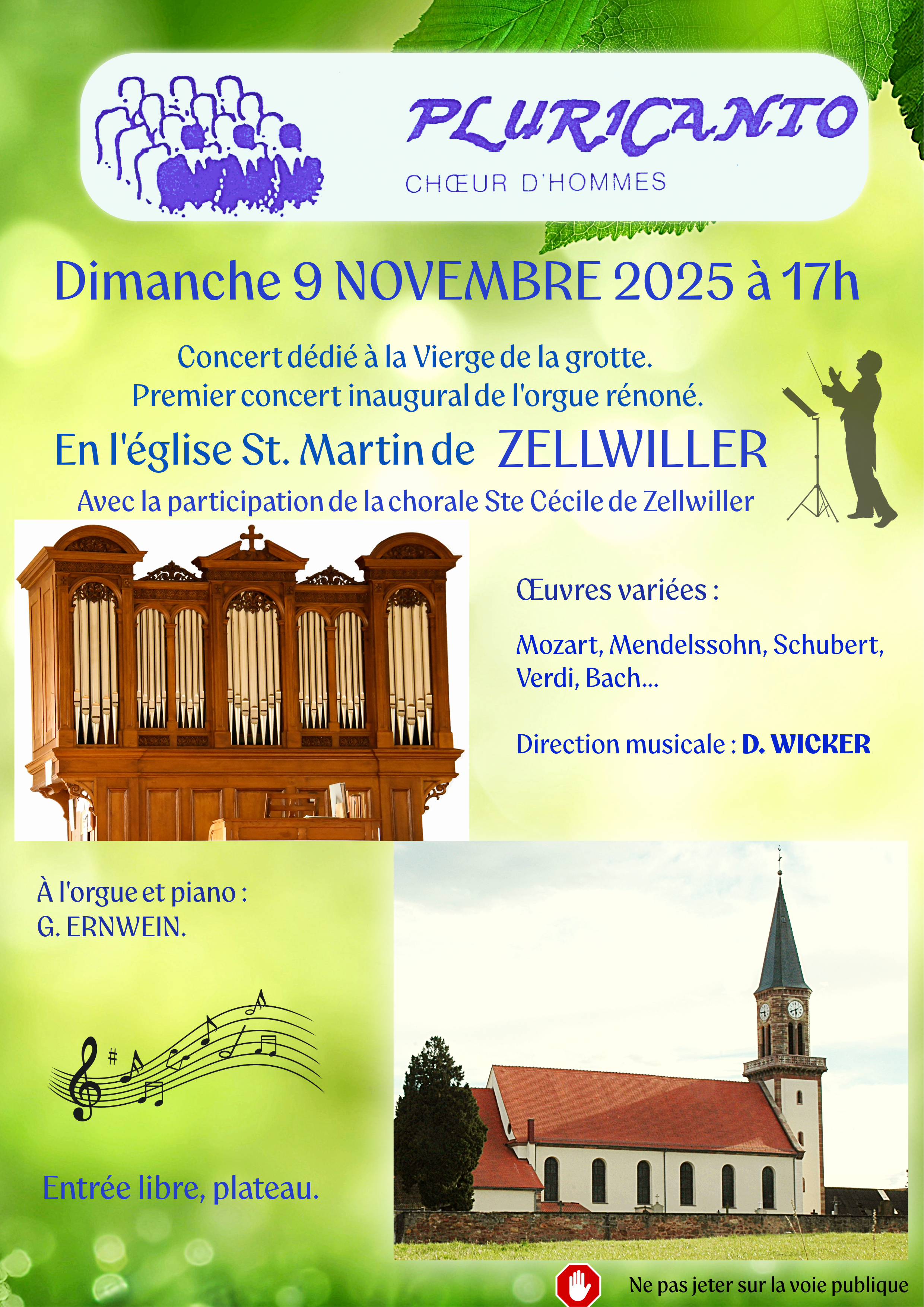 – Dimanche 9 novembre, 17h concert église St Martin Zellwiller.– Vendredi 5 décembre, 15h, concert EHPAD Truchtersheim– Dimanche 14 décembre, après-midi, Eglise – concert Noël, Stutzheim.